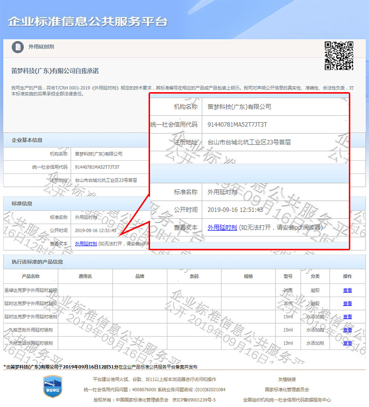 中国生殖健康产业协会授权使用《外用延时剂》团体标准(标准号:T/CRH 0001 -2019)的企业信息可以在“企业标准信息公共服务平台”进行查询。